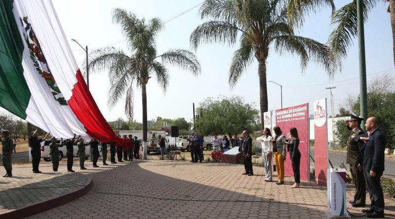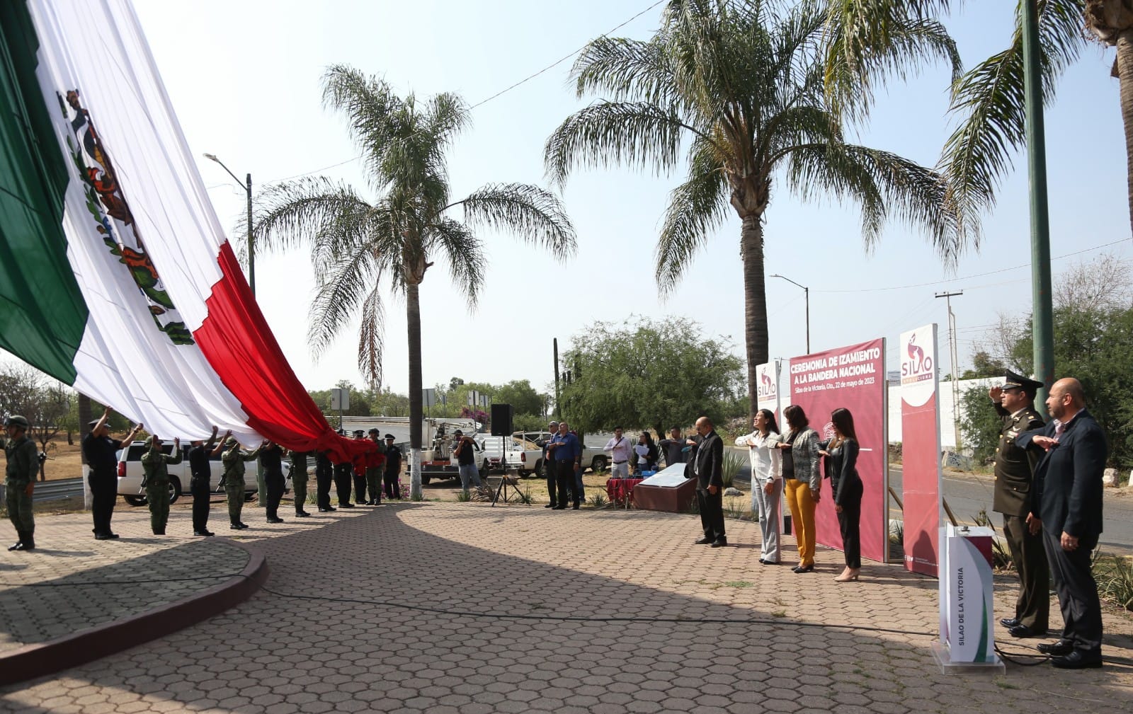 #Silao, #Gto.- En el marco de la conmemoración del 121 Aniversario luctuoso de Mariano Escobedo, el Gobierno Municipal encabezado por Carlos García Villaseñor, elementos del Ejército Mexicano y de la Policía Municipal realizaron el izamiento de la Mega Bandera a media Asta, en la plaza ubicada en la carretera salida a Guanajuato.