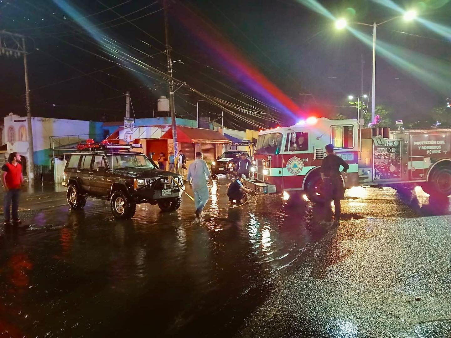 #Tepic, #Nay.- Elementos de Protección Civil y Bomberos de Tepic respondieron con prontitud a un llamado de emergencia en la intersección de Avenida Insurgentes y calle Bucerías, en la colonia Lindavista. En el lugar, una camioneta quedó varada debido al alto nivel del agua acumulada, bloqueando parcialmente la vialidad y generando complicaciones en el tránsito vehicular.